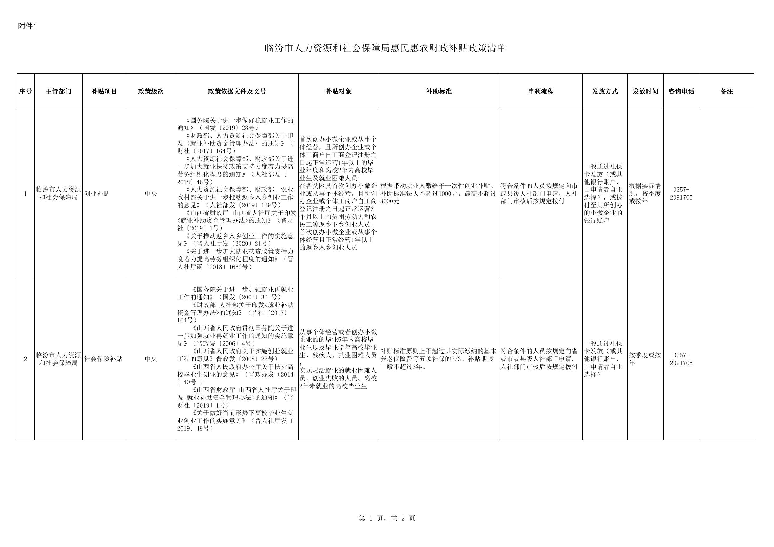 临汾市人力资源和社会保障局惠民惠农财政补贴政策清单.xls