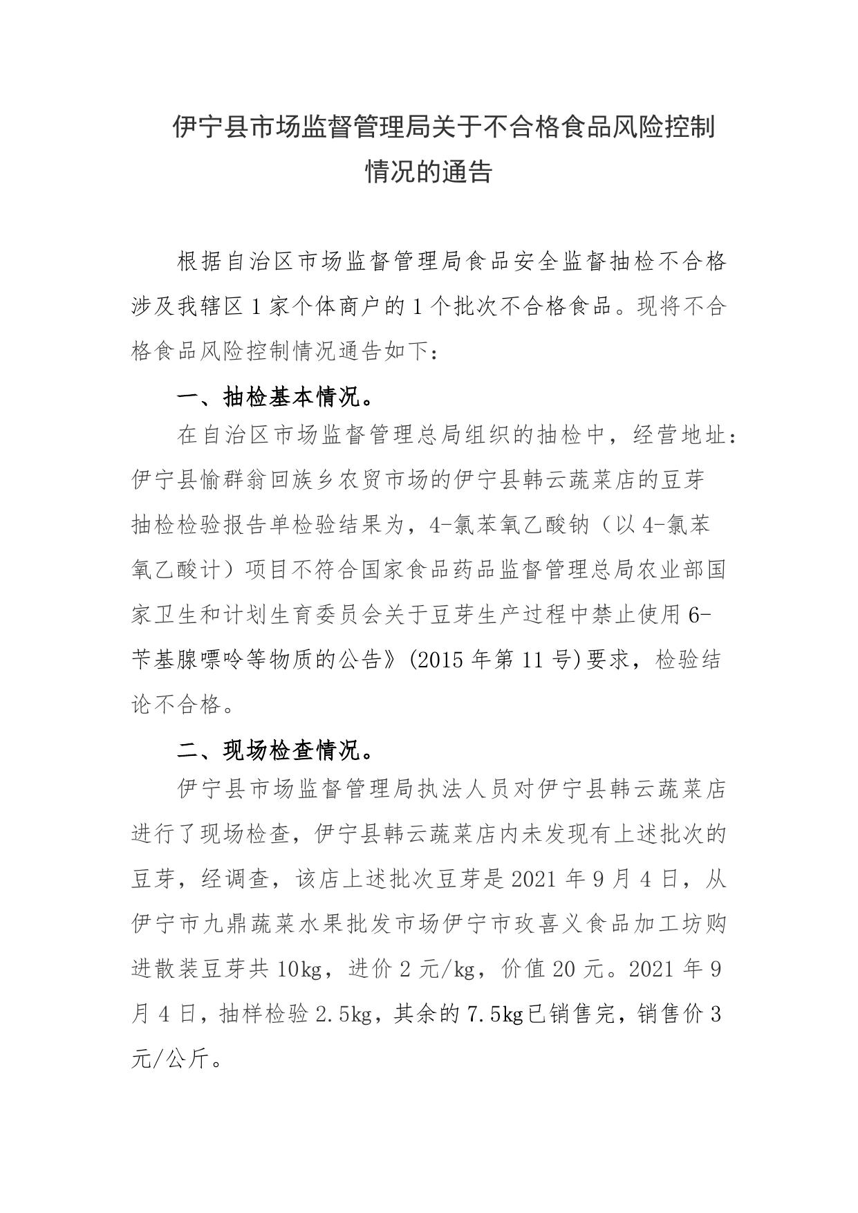 伊宁县市场监督管理局关于不合格食品风险控制情况的通告伊宁县韩云蔬菜店.docx