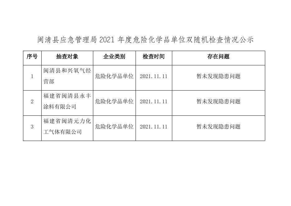 闽清县应急管理局2021年度危险化学品单位双随机检查情况公示.docx