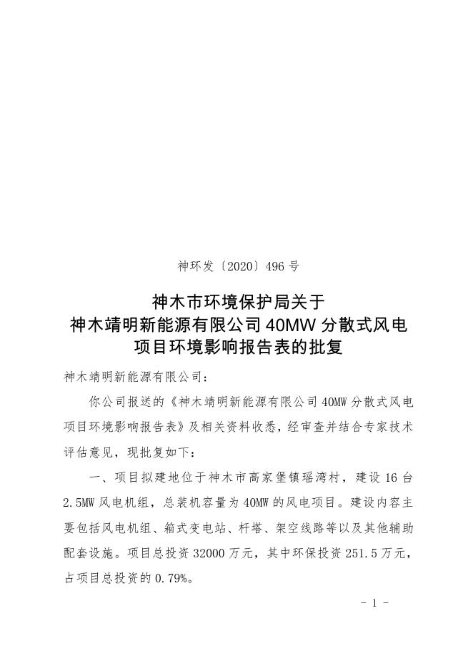 关于神木靖明新能源有限公司 40MW 分散式风电项目环境影响报告表的批复.pdf