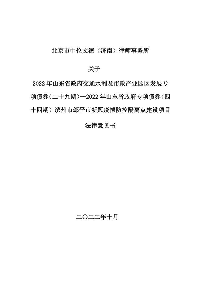 2022年山东省政府交通水利及市政产业园区发展专项债券(二十九期)--2022年山东省政府专项债券(四十四期)滨州市邹平市新冠疫情防控隔离点建设项目法律意见书.pdf