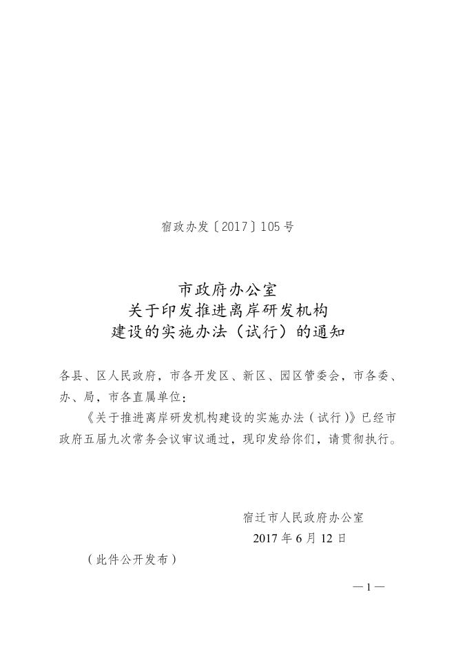 市政府办公室关于印发推进离岸研发机构建设的实施办法(试行)的通知.docx