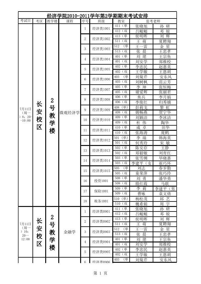 经济学院2010-2011学年第2学期期末考试监考安排.xls