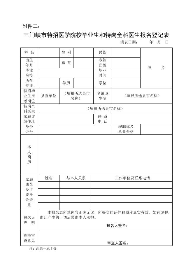 附件二《三门峡市特招医学院校毕业生和特岗全科医生报名登记表》.doc