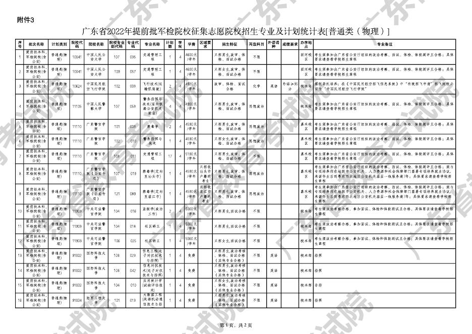 附件3:广东省2022年提前批军检院校征集志愿院校招生专业及计划统计表【普通类(物理)】.pdf