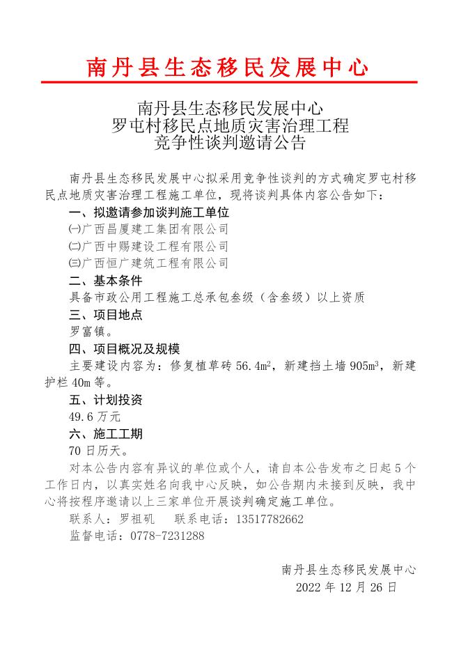 罗屯村移民点地质灾害治理工程竞争性谈判邀请公告.doc