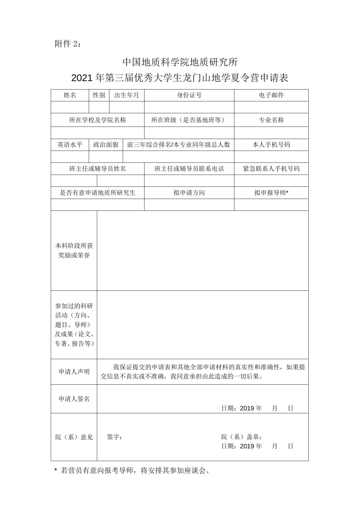 中国地质科学院地质研究所 2021年第三届优秀大学生龙门山地学夏令营申请表.docx