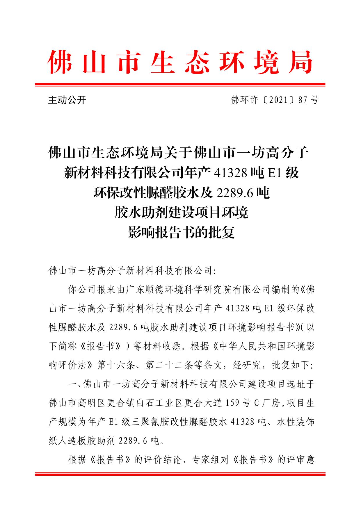 佛山市生态环境局关于佛山市一坊高分子新材料科技有限公司年产41328吨E1级环保改性脲醛胶水及2289.6吨胶水助剂建设项目环境影响报告书的批复.pdf