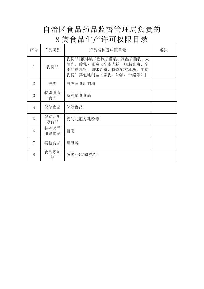 自治区食品药品监督管理局负责的8类食品生产许可权限目录.doc