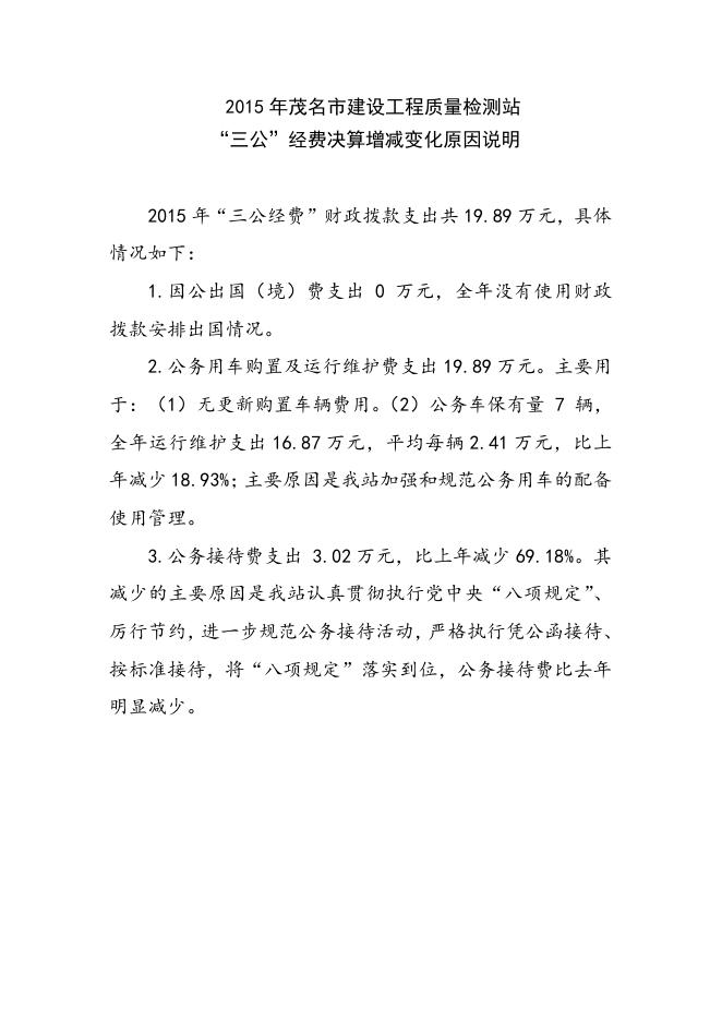 茂名市建设工程质量检测站2015年“三公”经费决算增减变化原因说明.doc