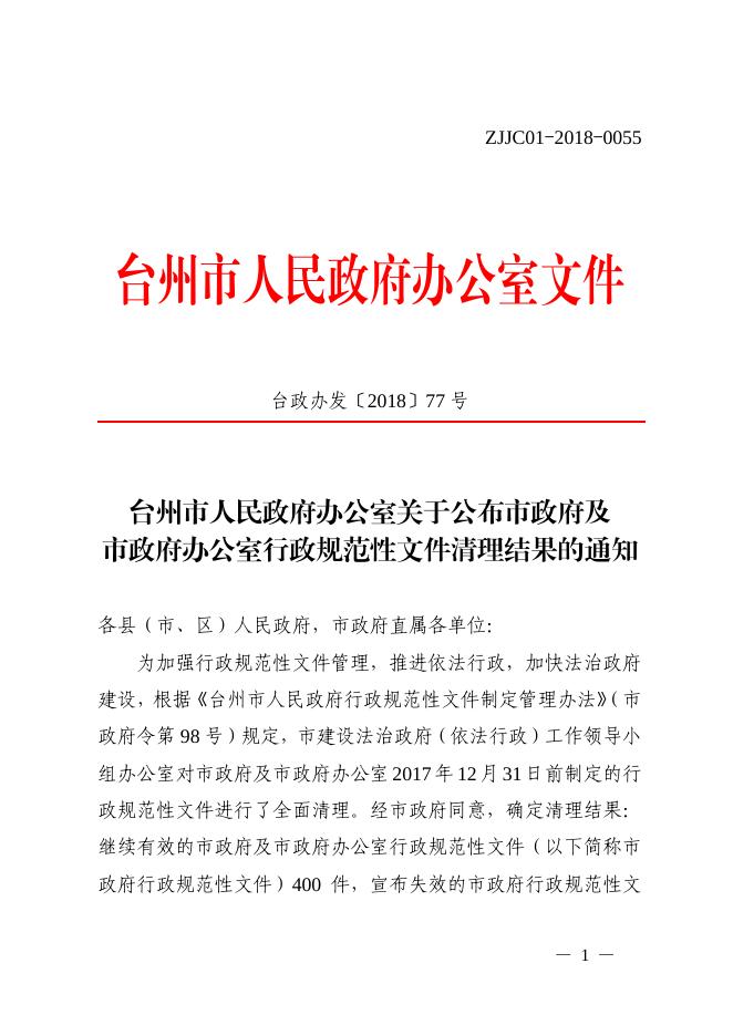 台州市人民政府办公室关于公布市政府及市政府办公室行政规范性文件清理结果的通知.pdf