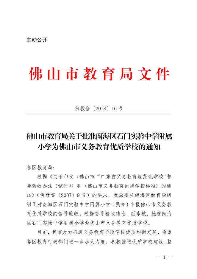 佛山市教育局关于批准南海区石门实验中学附属小学为佛山市义务教育优质学校的通知.pdf