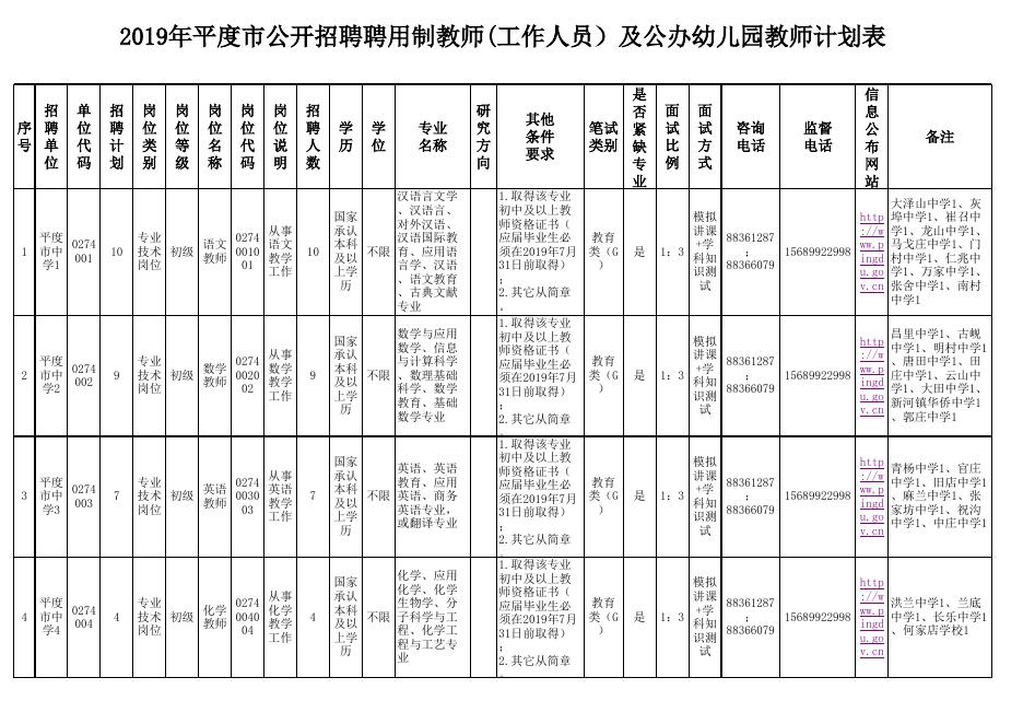 2019年平度市公开招聘聘用制教师及公办幼儿园招聘教师(工作人员)计划表.xls