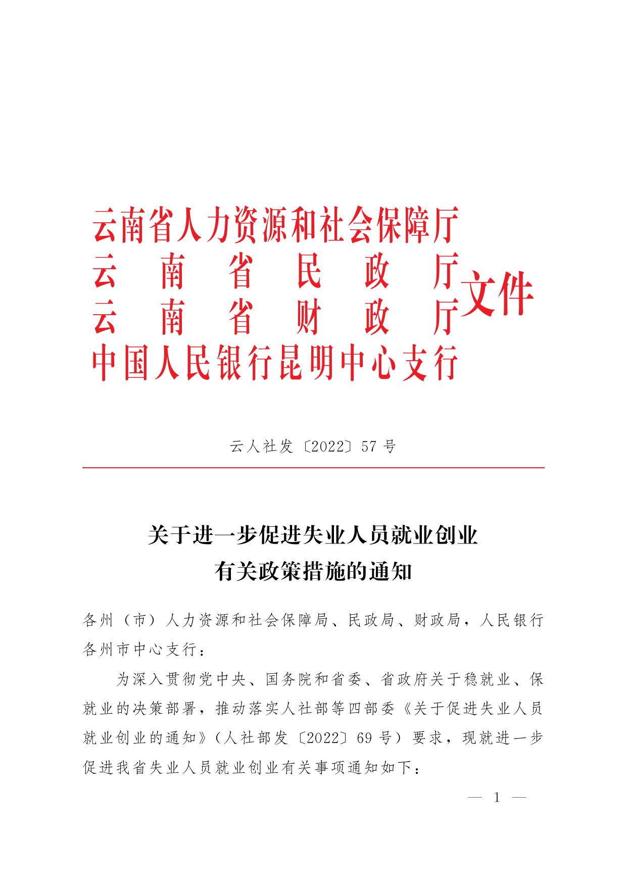 云南省人力资源和社会保障厅 云南省民政厅 云南省财政厅 中国人民银行昆明中心支行关于进一步促进失业人员就业创业有关政策措施的通知.pdf