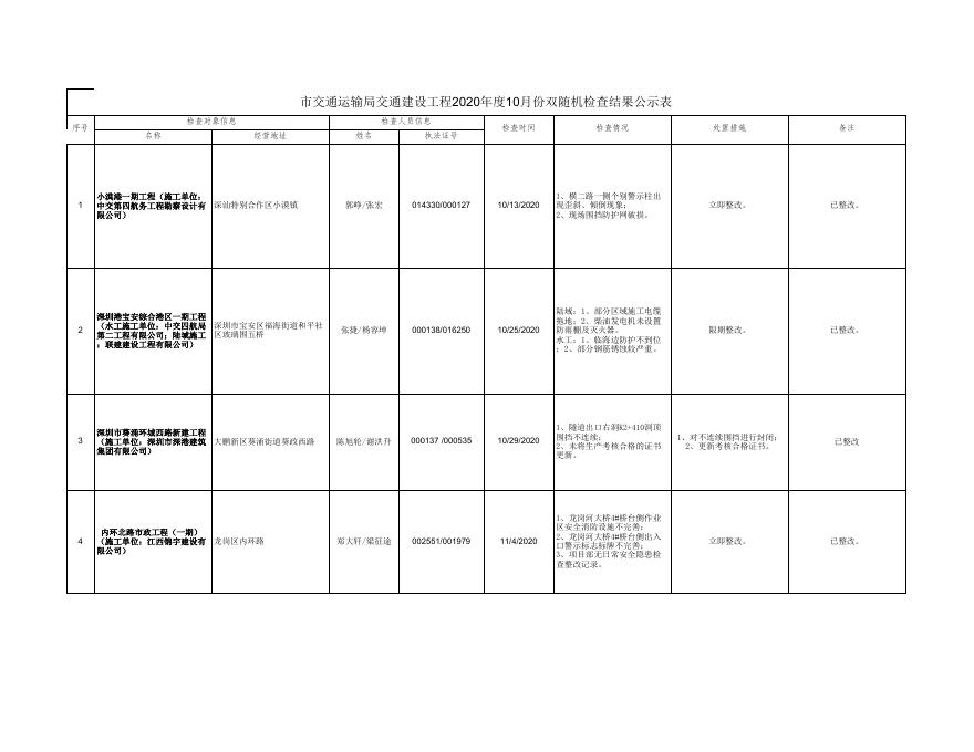 深圳市交通运输局交通建设工程2020年度10月份双随机检查结果公示表.xls