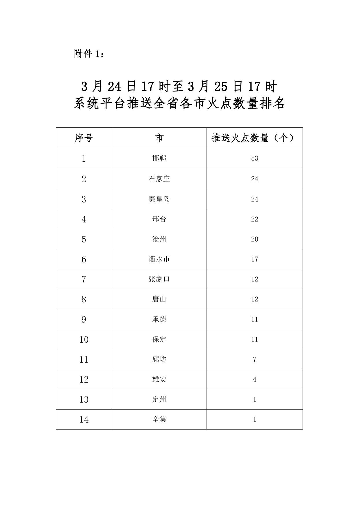 附件1:3月24日17时至3月25日17时系统平台推送全省各市火点数量排名.doc
