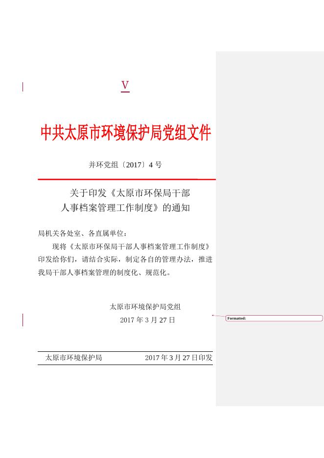 关于印发《太原市环保局干部人事档案管理工作制度》的通知.doc