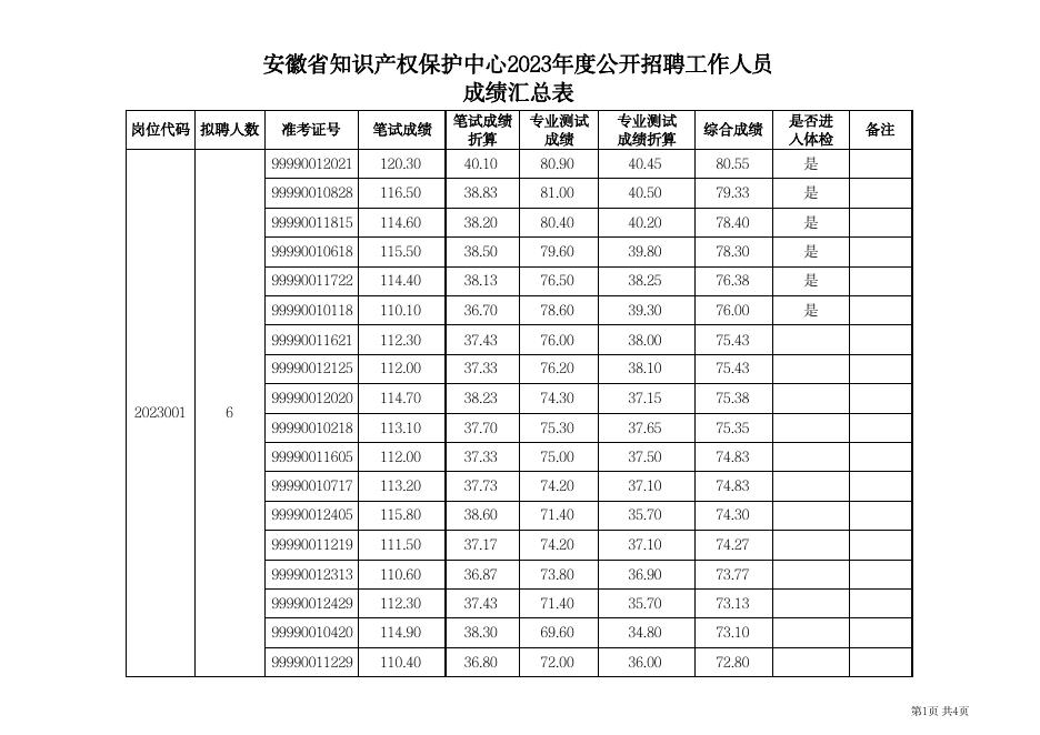安徽省知识产权保护中心2023年度公开招聘工作人员专业成绩汇总表.pdf