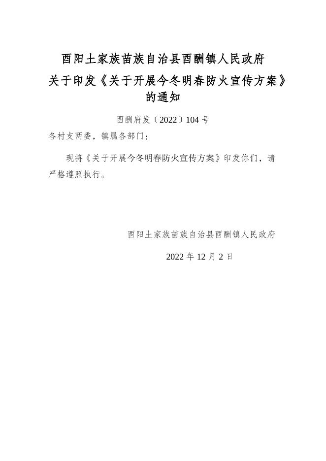 酉阳土家族苗族自治县酉酬镇人民政府关于印发《关于开展今冬明春防火宣传方案》的通知.docx