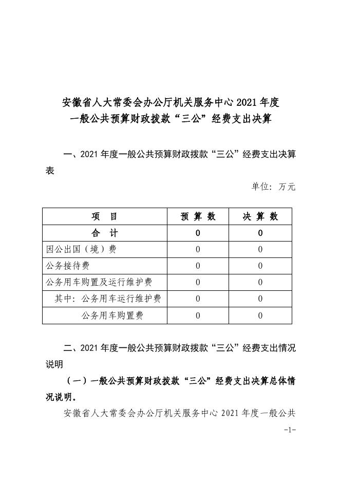1、安徽省人大常委会办公厅机关服务中心2021年度一般公共预算财政拨款“三公”经费支出决算.pdf