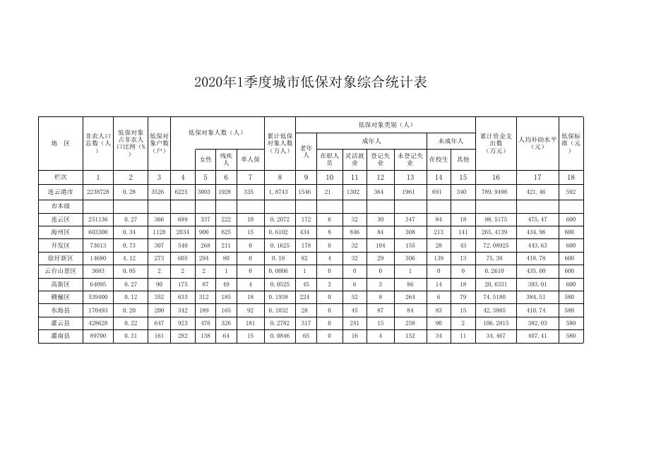 连云港市2020年第1季度城市低保对象综合统计表.xlsx