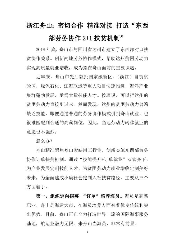 浙江舟山:密切合作 精准对接 打造“东西部劳务协作2+1扶贫机制”.doc