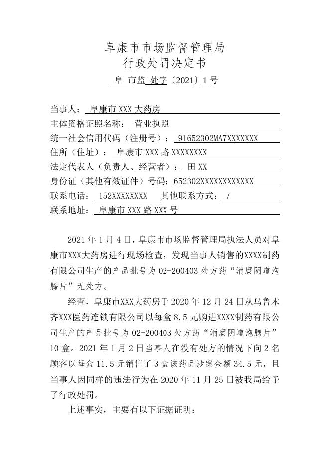 阜康市市场监督管理局行政处罚决定书( 阜市监处字〔2021〕1号).doc