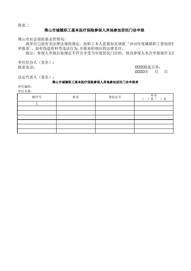 佛山市城镇职工基本医疗保险参保人异地参加居民门诊申报表 2016.xls