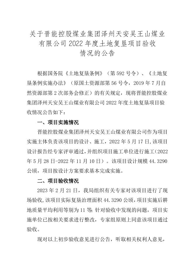 晋能控股煤业集团泽州天安吴王山采煤损毁塌陷区2022年度土地复垦项目公示.doc