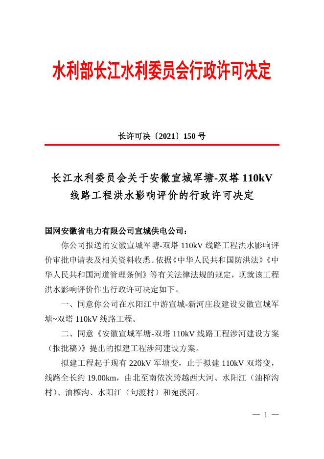 长江水利委员会关于安徽宣城军塘-双塔110kV线路工程的批复.doc