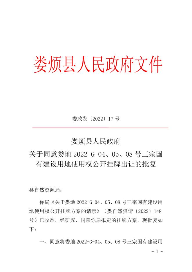 娄烦县人民政府关于同意娄地2022-G-04、05、08号三宗国有建设用地使用权公开挂牌出让的批复.docx