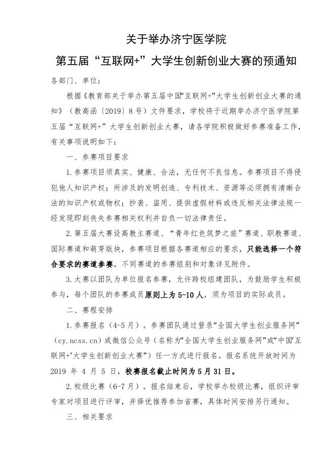 关于举办济宁医学院第五届“互联网+”大学生创新创业大赛的预通知.doc