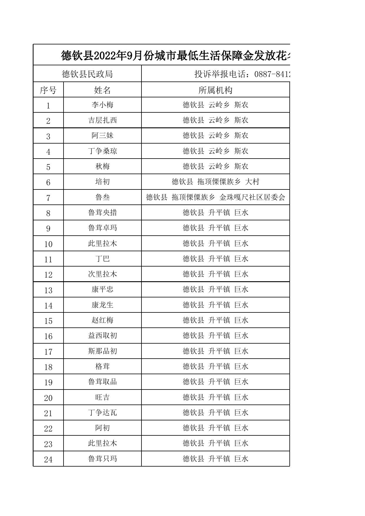 德钦县2022年9月份城市最低生活保障金发放花名册公示 .xls