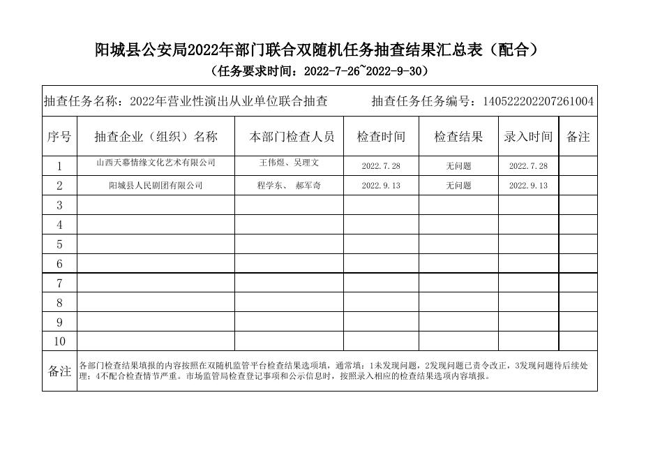 阳城县公安局2022年营业性演出部门联合双随机任务抽查结果汇总表(配合).xlsx