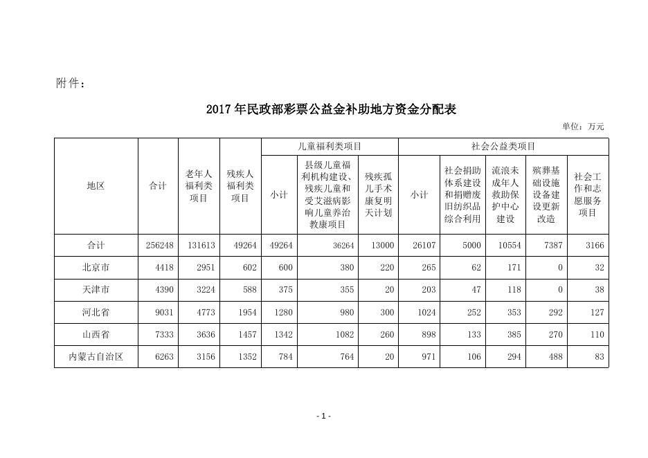 附件:2017年民政部彩票公益金补助地方资金分配表.doc
