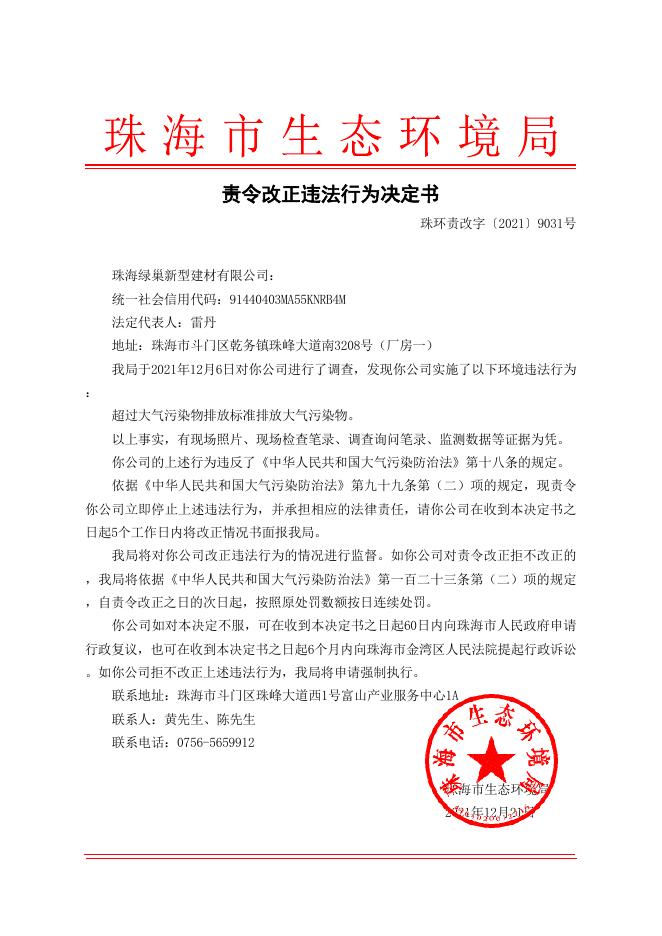 《责令改正违法行为决定书》珠环责改字〔2021〕9031号(珠海绿巢新型建材有限公司).doc