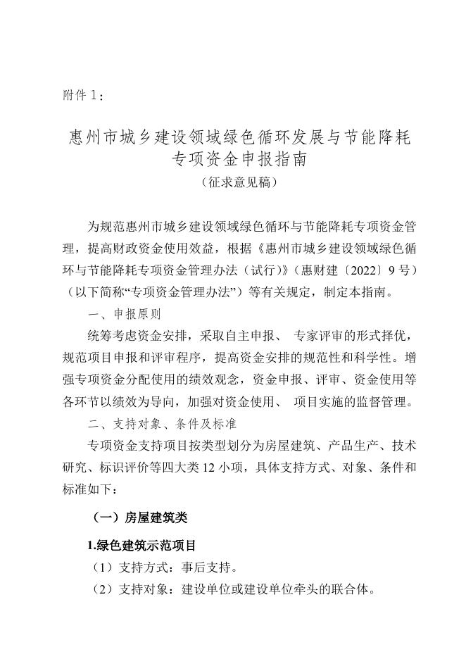 附件1:惠州市城乡建设领域绿色循环发展与节能降耗专项资金申报指南(征求意见稿).doc