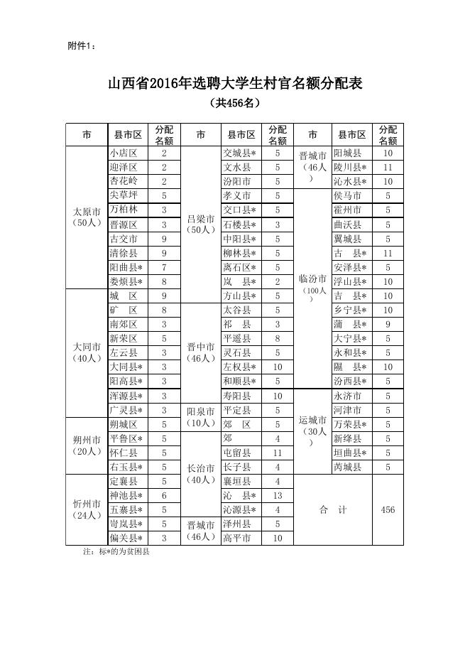 附件1:山西省2016年选聘大学生村官名额分配表.xls