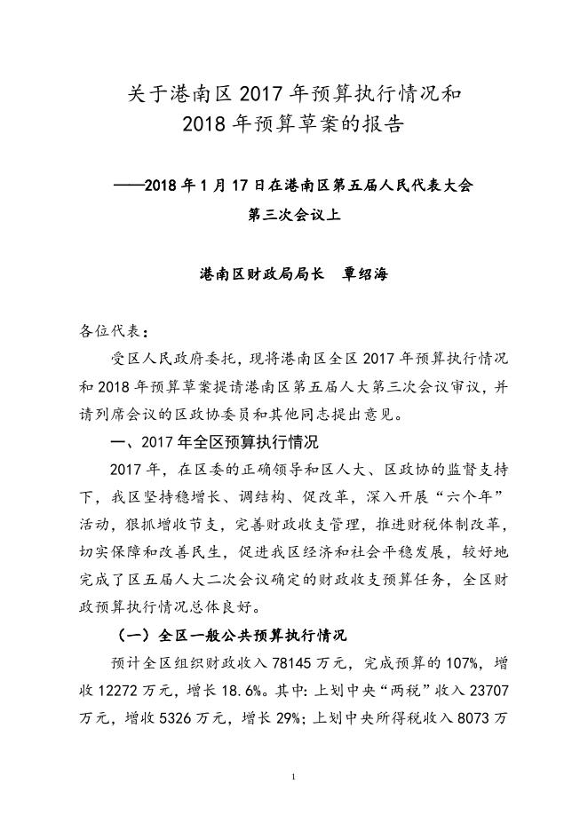 1、关于2017年港南区预算执行情况及2018年预算草案的报告.doc