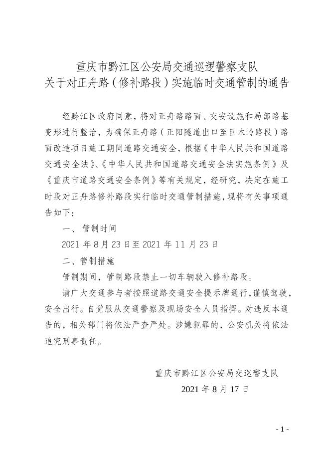 重庆市黔江区公安局交通巡逻警察支队关于对正舟路(修补路段)实施临时交通管制的通告.doc