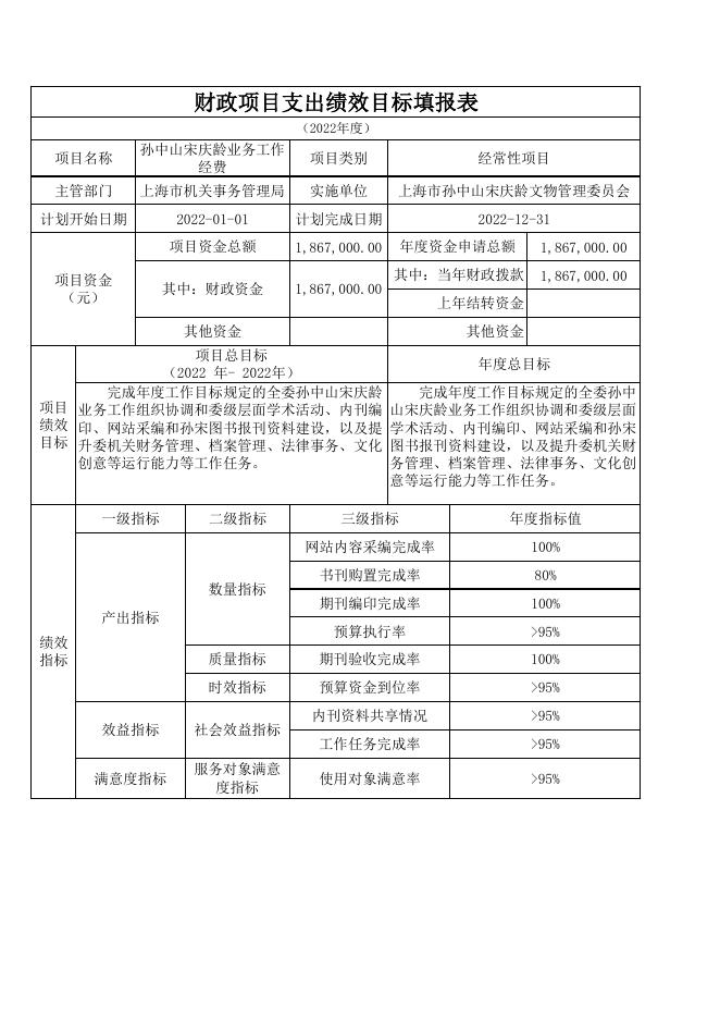 上海市孙中山宋庆龄文物管理委员会2022年度财政项目支出绩效目标.pdf
