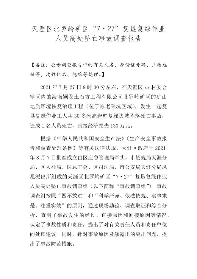 (公示稿)天涯区北罗岭矿区“7·27”复垦复绿作业人员高处坠亡事故调查报告.docx