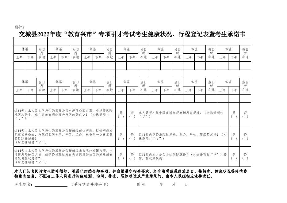 《交城县2022年度“教育兴市”专项引才考试考生健康状况、行程登记表暨考生承诺书》.xls