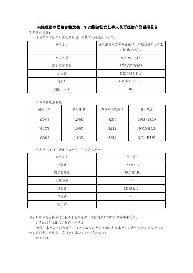南银理财珠联璧合鑫逸稳一年76期封闭式公募人民币理财产品到期公告.pdf