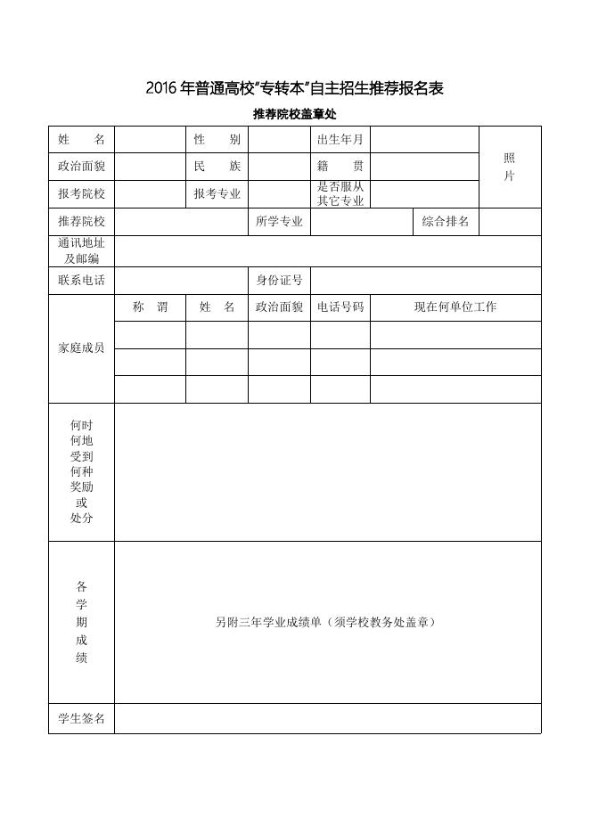 2016年普通高校“专转本”自主招生推荐报名表.doc