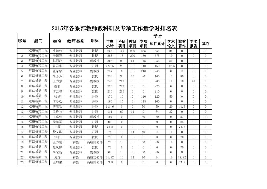 附件3:2015年度全校各系部教师教科研及专项工作量学时排名表.xls