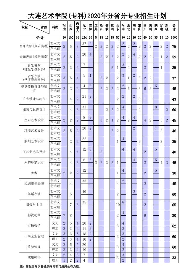 大连艺术学院2020年分省分专业招生计划(专科).xls