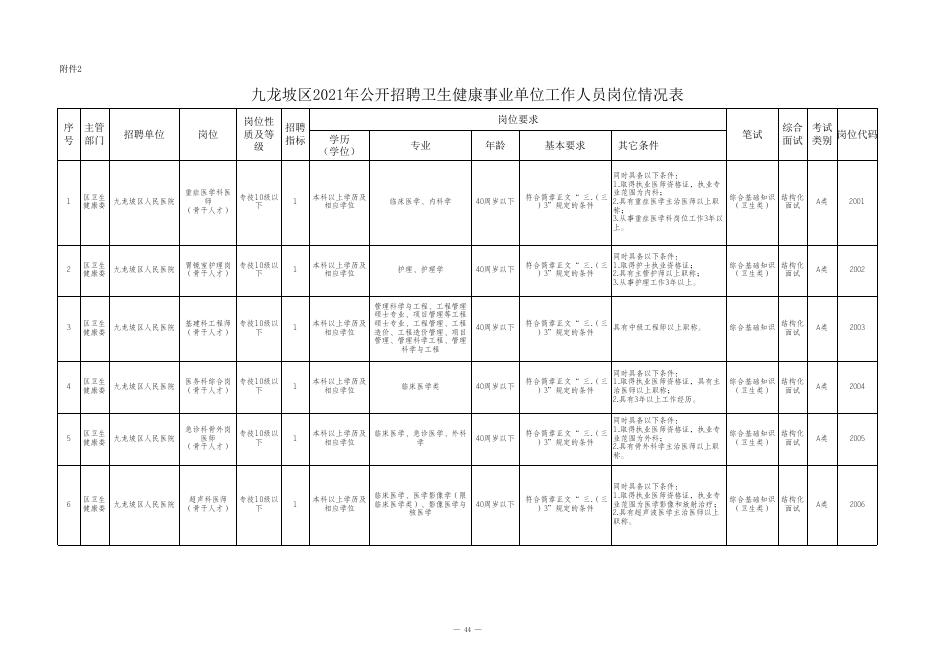 附件2:九龙坡区2021年公开招聘卫生健康事业单位工作人员岗位情况表.xls