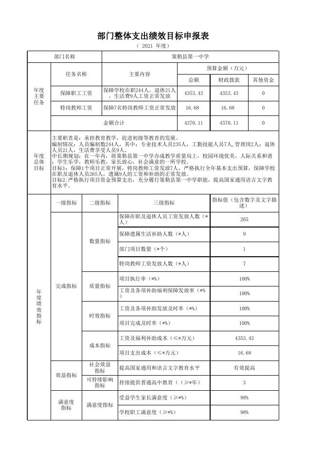 策勒县第一中学部门整体支出绩效目标.xlsx