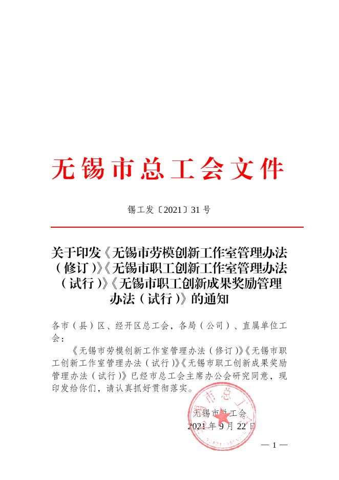 关于印发《无锡市劳模创新工作室管理办法(修订)》《无锡市职工创新工作室管理办法(试行)》《无锡市职工创新成果奖励管理办法(试行)》的通知.pdf